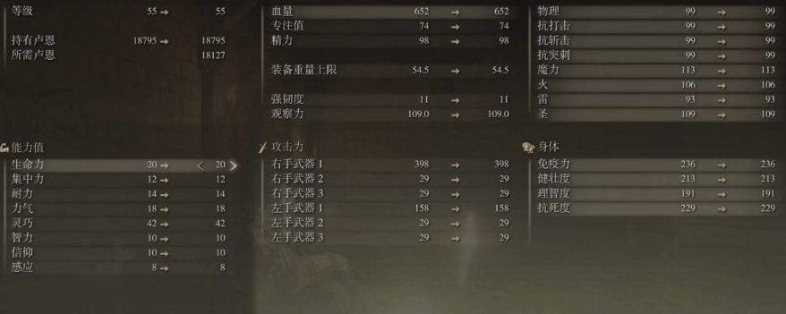 角色加点直接影响开荒体验和战斗风格。新手应优先提升生命力至20点,确保基础生存能力,随后根据所选武器类型分配主属性。近战职业如武士或流浪骑士,初期建议穿插提升力量与敏捷至20点,同时保持耐力在15点左右以满足装备负重需求。法系职业如观星者则