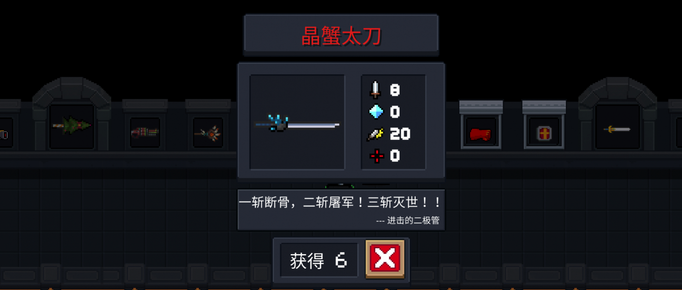 打水晶巨蟹的时候记得别用近战武器硬刚,这家伙会给自己回血,最好带高伤害的远程武器速战速决。打完BOSS后开宝箱有概率出晶蟹太刀,如果没出也别灰心,可以直接在2-1关卡中断游戏,这样既能保留金币奖励,又能节省时间重新刷。坚持用这个方法,刷满8次后就能在锻造台永久打造啦,以后就不用再辛苦蹲BOSS了。