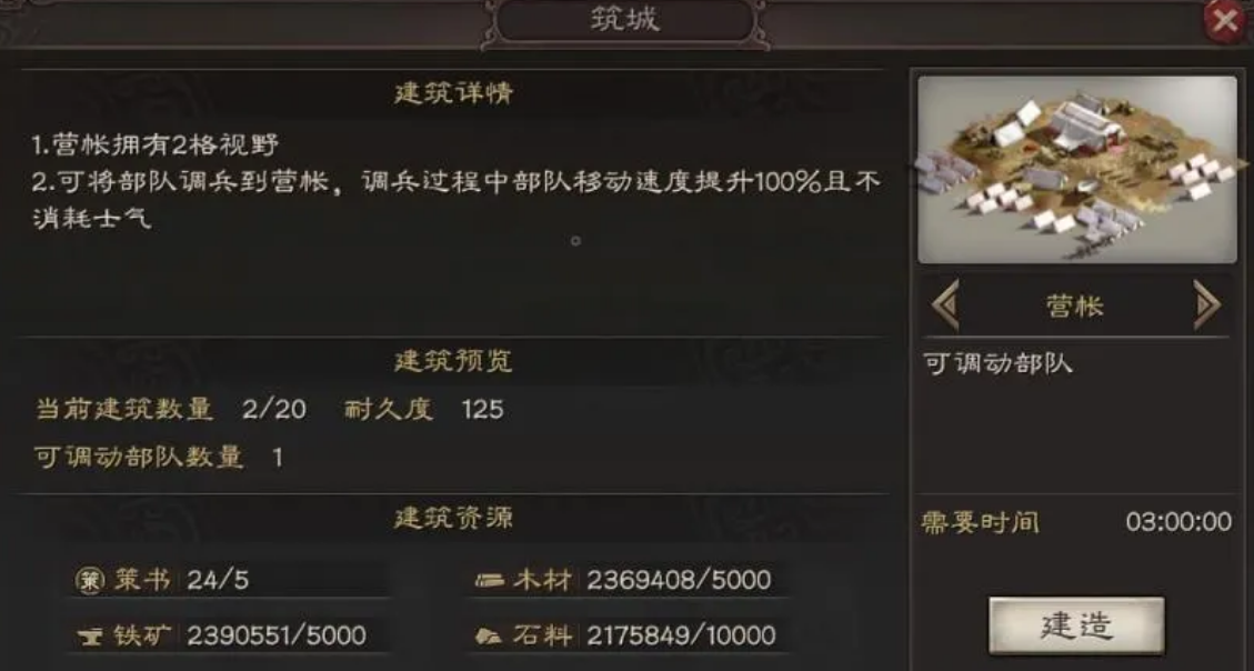 一级营帐基础建造时间为3小时,每升一级减少1小时,最高等级受工程营限制。升级需消耗额外资源,但能提升耐久度与可驻守部队数量,二级营帐即可满足同盟攻城需求(1主力+1器械队)。建议前期储备2-3个营帐备用,优先将军机营升至2-3级以解锁足够建造数量,州战阶段保持营帐等级与工程营同步发展。
