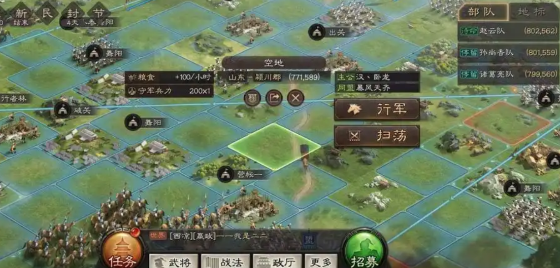 营帐的核心功能在于提升军事行动效率。部队在营帐间调动可享受100%速度加成且不消耗士气,而长途行军会因士气衰减导致战斗力下降70%。多线征兵是另一关键用途,允许主城与多个营帐同步征兵,显著缩短兵力补充周期。营帐提供2格视野范围,可作为前线临时指挥中心,同时能阻挡敌方行军路线,但需注意其位置需避开敌方主力行军路径以避免被拆除。