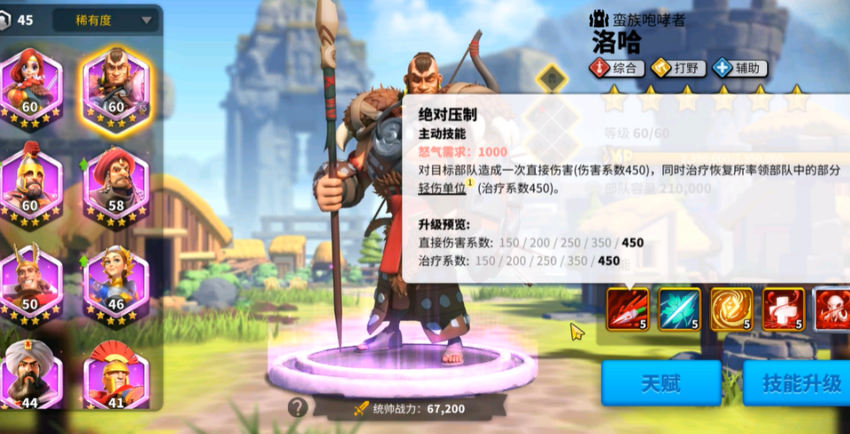 洛哈的技能组完全围绕打野设计,推荐升级顺序为1→3→2→4。一技能绝对压制兼具450系数伤害和等量治疗效果,是唯一拥有主动回血能力的打野技能。三技能洛哈的试炼提供70%经验加成,配合天赋可显著提升其他武将培养效率。二技能制裁增加35%对野怪伤害,虽不及传说武将的50%加成但获取难度更低。觉醒技能不屈斗魂使脱战后获得2000系数治疗,配合天赋命运吟诵的500系数治疗效果,形成强大的野外续航体系。