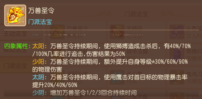 狮驼岭作为物理输出门派,法宝搭配的核心思路是提升伤害和生存能力。推荐优先选择飞剑、万兽圣令、风袋和金甲仙衣这四件被动法宝。飞剑能直接增加物理伤害,建议选择太阴属性提升暴击率;万兽圣令是门派专属法宝,能大幅提升召唤兽的输出;风袋增加速度确保出手顺序;金甲仙衣则能减免物理伤害,提高生存能力。主动法宝方面,苍白纸人和惊魂铃是不错的选择,前者能临时免疫伤害,后者有概率驱散敌方宠物。
