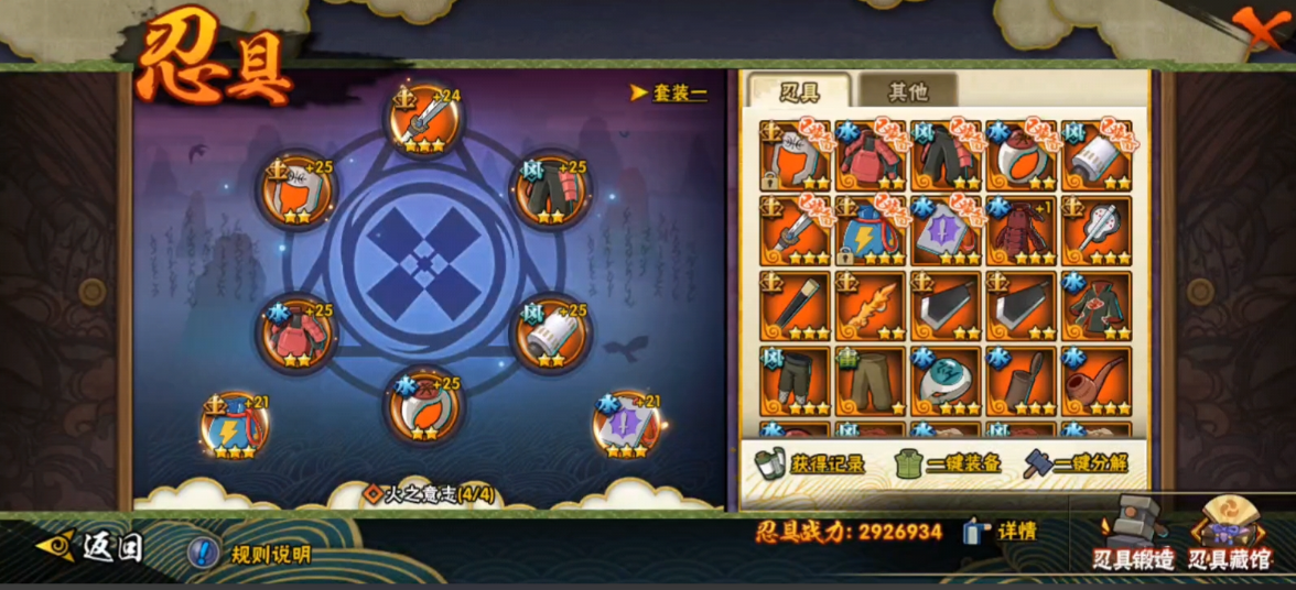 忍具是提升战力的核心途径之一,尤其是究级忍具的加成效果最为显著。一套完整的究级忍具(包含六个部位)经过基础精炼后,单件可提供约10万战力,六件合计约60万战力。若激活套装效果,还能额外增加10万战力,总加成可达70万左右。需忍具品质分为普通、优秀、精良、传说和究级,其中究级忍具的战力加成远超其他品质,因此优先获取究级忍具是提升战力的关键。