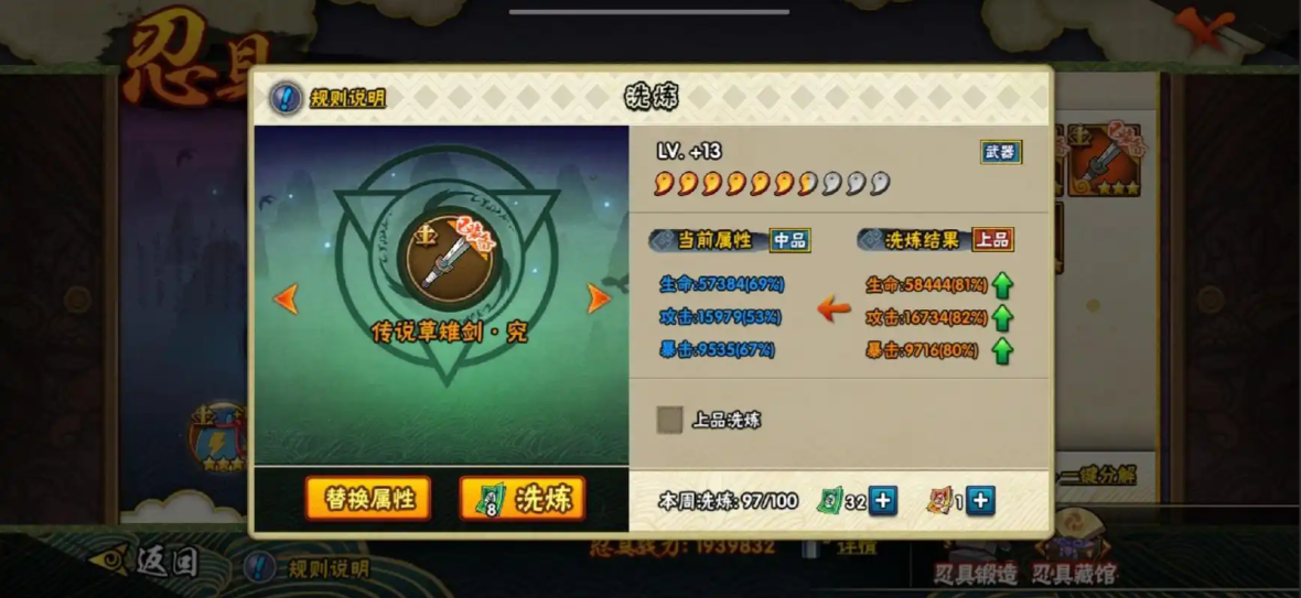 忍具的战力加成不仅取决于品质,还与强化等级和精炼效果密切相关。精炼忍具时,单次精炼可增加8000至20000战力,不同部位的加成幅度略有差异。武器部位的强化收益通常高于其他部位。忍具的品级(上品、中品、下品)也会影响最终属性,将忍具洗练为上品可进一步提升战力。但洗练需消耗金币和材料,建议优先确保忍具套装齐全后再投入资源优化品级。