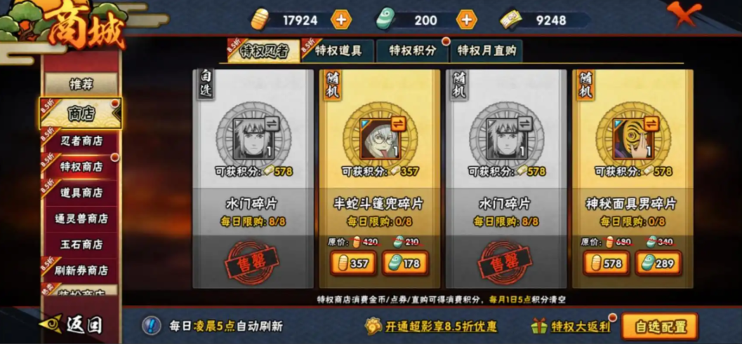 高级招募和限定招募是直接获取完整忍者的主要渠道。建议在活动期间集中投入资源,例如高招S忍首付机制下,提前储备16800金币可大幅提升成功率。特权商店对VIP玩家开放后,可直接购买部分忍者碎片,但需注意碎片价格与金币消耗的平衡。积分赛和决斗场商店也能用积分兑换A级或B级忍者。