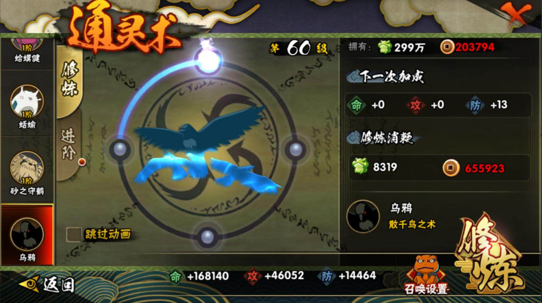 声望的获取相对慢一些,主要靠修行之路和组织贡献。建议每周集中打一次修行,先手动打到打不过再扫荡,这样收益最大化。平时多和组织小伙伴一起打判忍,判忍掉落的声望材料记得及时兑换。如果铜币实在紧张,可以适当放缓乌鸦升级节奏,先把其他通灵兽的基础属性点满,毕竟战力提升是综合性的。铜币在游戏里是硬通货,忍者升级、装备强化、勾玉培养全都要用。建议每天招财免费次数必点,商城特价铜币包看情况买,剩下的就交给时间。