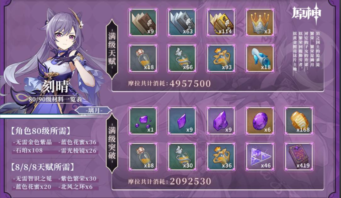20级突破需要1个最胜紫晶碎屑、3个石珀和3个骗骗花蜜,40级则要3个最胜紫晶断片、2个雷光棱镜、10个石珀和15个骗骗花蜜。50级往后需求逐渐增加,60级突破要3个最胜紫晶块、8个雷光棱镜、30个石珀和18个微光花蜜。80级最终突破需要6个最胜紫晶、20个雷光棱镜、60个石珀和24个原素花蜜,记得提前规划体力分配。