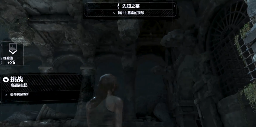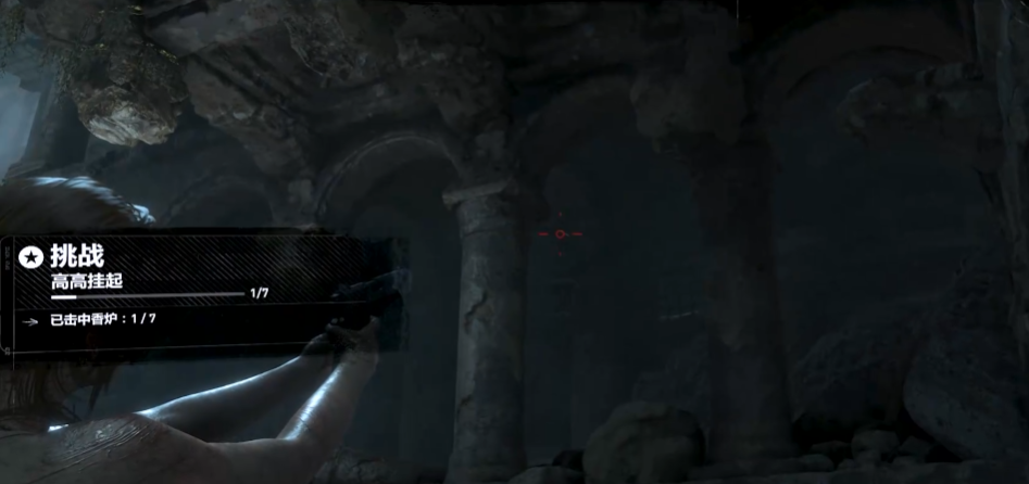 高高挂起挑战要求玩家击落7只黄金香炉。这些香炉分布在古墓中庭区域,位置较为隐蔽,需要仔细观察环境并利用生存本能高亮显示功能辅助定位。第一个香炉位于劳拉初始位置左侧二层廊内,第二个在右侧二层廊内,射击时需注意调整角度确保命中。