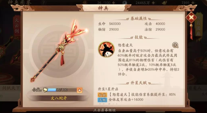 神兵系统的培养需兼顾星级与铸灵效果。高阶神兵的基础属性与技能强度远超低阶装备,因此资源应集中投入核心武将的武器。金色神兵铸灵至木灵阶可激活大量战力加成,而红色神兵如雌雄双股剑和火云剑可通过碎片升星提升实用性。多余的紫色与橙色神兵可分解为精魄,用于兑换红色碎片或铸灵材料,优化资源分配效率。
