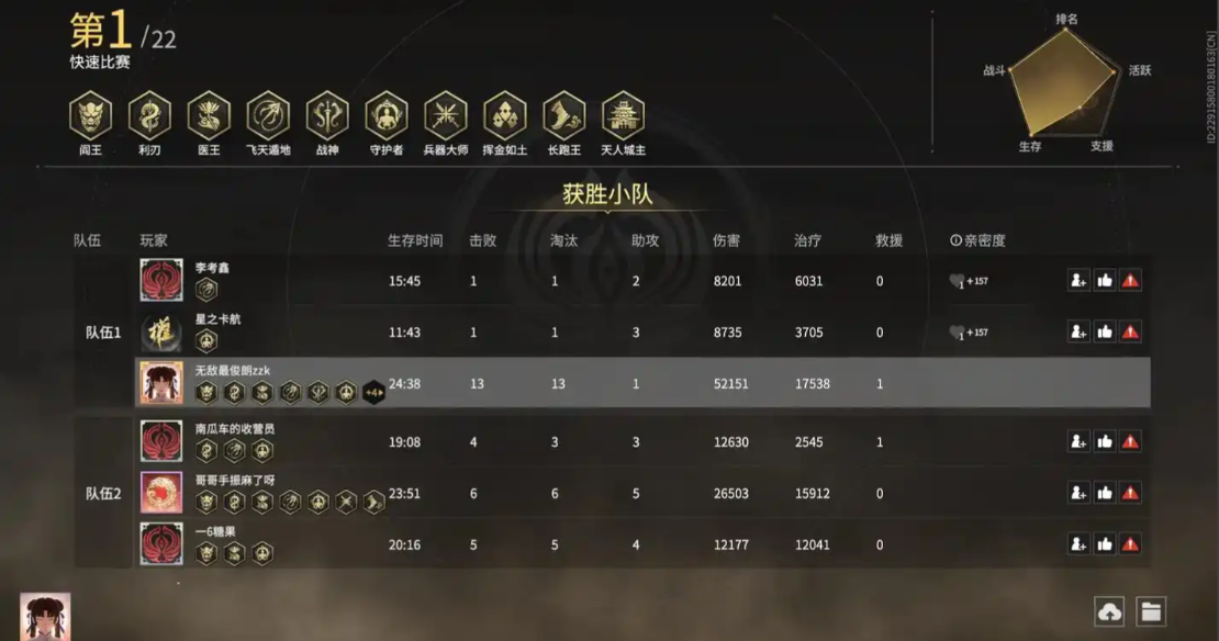 加分机制主要基于排名、击败数、伤害量、助攻数和生存时间等核心要素。排名越高加分越多,进入前10名即可获得基础加分,排名越靠前加分倍数越高。击败其他玩家可以获得额外加分,击败排名越高的玩家获得的加分越多。对敌人造成的伤害量也会影响最终加分,伤害量越高加分越多。协助队友击败敌人可以获得助攻加分,助攻数越多加分越多。生存时间越长获得的加分越多,使用魂玉、完成特定任务等也会获得少量加分。