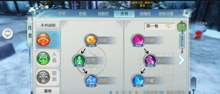 天书搭配上,花仙系建议走中路点出神行乘云减少核心位移技能的冷却时间;弓神系主加左列逐风火灵提升输出,辅以浮波增强控制;兽王系则优先左列凶狼挥洒强化爆发。剩余点数可投入弓神右列的极光补充功能性。操作时需注意轮回闪赤乌坠等技能已优化为可移动释放,配合大羿王状态能实现高机动输出。