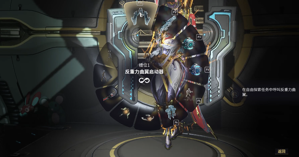 最终阶段需在铸造舱完成反重力曲翼的组装。组合远古陨蜓系统与启动器模块后,需在军械库的消耗品栏位装备曲翼。平原使用时按Q键调出装备轮盘选择启动,太空场景则自动装备。注意曲翼能源会随时间消耗,需通过击杀敌人或使用能量补给道具维持续航。任务全部完成后,将解锁后续的九重天航道星舰任务线。