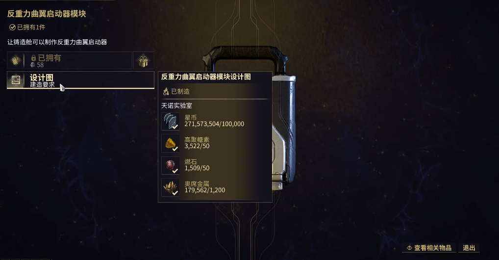 第二阶段需进入氏族道场的天诺实验室复制反重力曲翼启动器模块图纸。通过快速移动功能抵达实验室后,在黄色研究面板处消耗15000新币复制图纸。所需材料包括50个高聚糖素、50个燃石和1200个奥希姆合金,这些材料可通过平原采矿或敌人掉落获取。铸造过程需24小时,建议提前储备材料以节省时间。