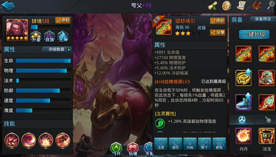 一技能定魂一击是夸父的核心控制手段,投掷封魔刃造成基于当前生命值百分比的物理伤害,并附加定魂状态禁锢目标,随后跳跃至目标位置引发范围击飞与眩晕。觉醒后每次跳跃命中单位可生成基于已损失生命值的护盾,兼具突进、爆发与生存三重功能。二技能封魔斩被动效果受普攻时有概率自动反击,主动释放则为范围斩击,命中单位越多则生命恢复量越高,配合残血免伤机制能实现极限续航。该技能附加的封魔状态可干扰敌方技能释放,但触发概率需依赖攻速属性支撑。