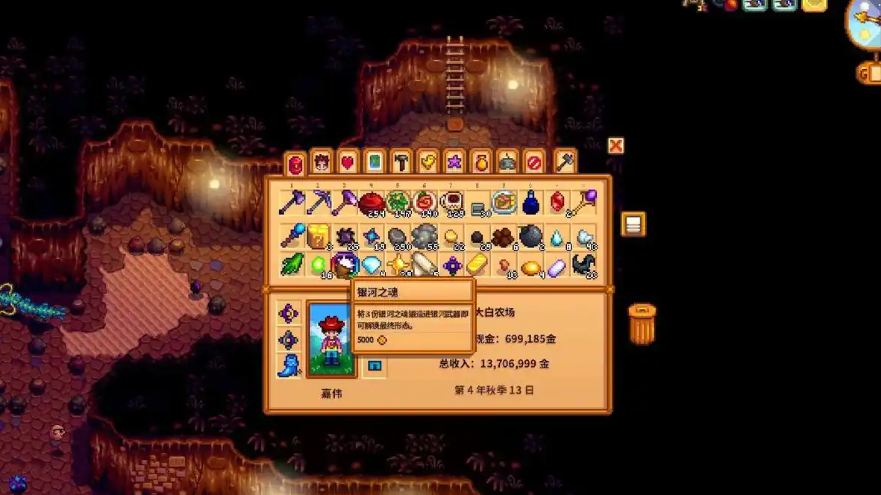 五彩碎片是兑换银河剑的必备物品,虽然爆率较低,但可以通过采矿、钓鱼宝箱、万象晶球或炸矿获得。如果运气不错,在矿井90层之后挖矿时有机会找到。拿到五彩碎片后,记得直接去沙漠的三根石柱中间站着,手持碎片等待动画结束,就能拿到银河剑。如果暂时没刷到五彩碎片,可以先攒钱买银河镐和锄头,它们能大幅提升采矿和耕作效率。银河三件套的收集需要耐心,建议先搞定银河剑,再逐步强化。拿到银河剑后,记得去探险家公会解锁银河之锤和银河匕首。平时多下矿积累资源,同时关注齐先生的任务进度,这样能更快集齐材料。