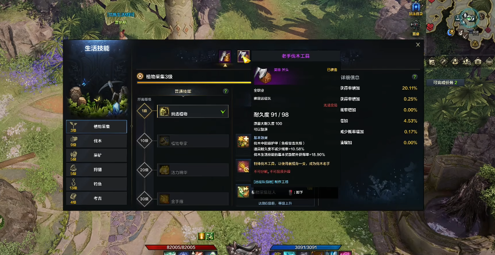 生活技能是角色成长的重要辅助系统,分为采集、伐木、采矿、钓鱼、狩猎和考古六大类。每项技能最高可提升至30级,分为四个阶段(1级、10级、20级、30级),不同等级对应不同品质的材料。生活技能需消耗体力值,体力为账号共享资源,需合理分配。提升技能等级可解锁更高阶材料采集权限,同时增加获取材料的数量和品质概率。