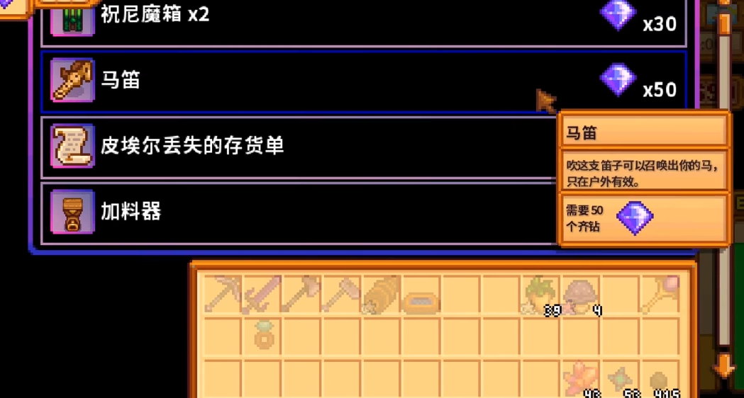 使用马笛非常简单,选中后点击右键即可。马匹会立即传送到附近,再也不用担心马走丢或跑远。需马笛只能召唤自己农场的马,野外遇到的马无法召唤。如果还没有马厩,记得先找罗宾建造一个。马笛是后期非常实用的工具,能大幅提升移动效率。虽然收集金色核桃和齐钻需要一定时间,但兑换后绝对物超所值。