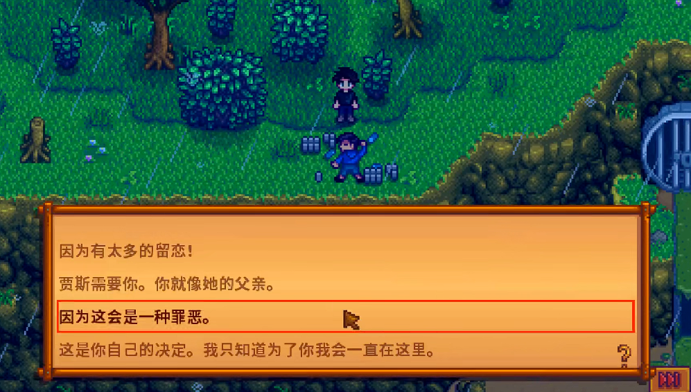 6心剧情比较关键,需要在雨天早上9点到晚上8点之间去煤矿森林。这时候会发现谢恩醉醺醺地站在悬崖边,无论你怎么劝他,最后他都会被送去医院。第二天他会来道歉,并且开始尝试戒酒。8心时去玛妮家,他会告诉你他在养鸡,还会解锁蓝色母鸡。虽然蓝鸡和普通鸡没啥区别,但看着挺特别的。