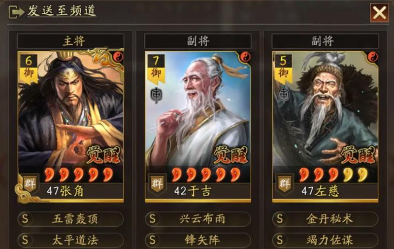 这套阵容怎么搭,核心思路其实就是围绕着张角这个绝对输出核心来构建一个坚固的堡垒。最常见的配将方式就是让张角担任主将,带上太平道法和士别三日这两个战法。太平道法能大幅提升张角自带战法五雷轰顶的发动几率,并且还能增加奇谋暴击,是张角输出的发动机;士别三日则在前期提供规避保命,并在第四回合给张角一次稳定的高额谋略伤害,让他的输出曲线更平滑。至于副将于吉和左慈,他们的任务就是全力保护和辅助张角。于吉通常携带草船借箭和锋矢阵,草船借箭是顶级的群体治疗和净化战法,能极大保证队伍的续航和解控能力,而锋矢阵则是核心中的核心,它能大幅增强主将张角的伤害,同时为于吉和左慈提供减伤,完美契合二保一的战术思想。
