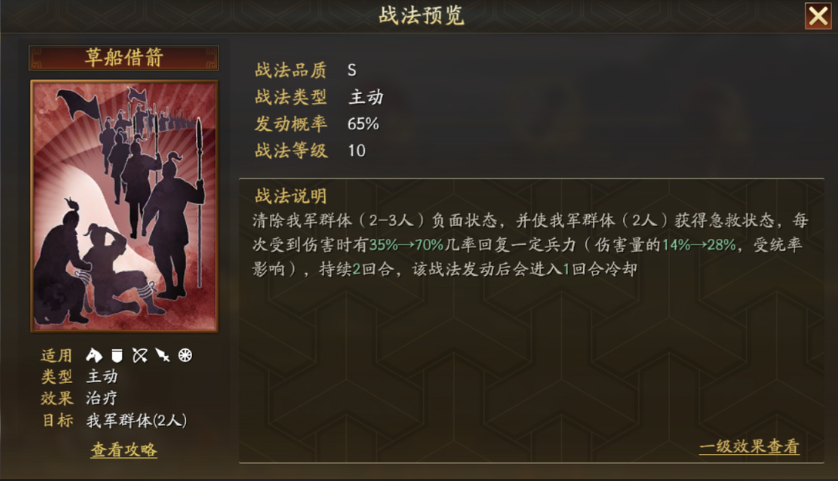 左慈在这个体系里的作用同样关键,他自带战法金丹秘术能给全体提供前两回合的规避效果,这相当于一个强大的开局免伤盾。他的战法选择通常是竭力佐谋搭配刮骨疗毒。竭力佐谋有概率让自带战法发动率提高,并且能削弱敌军,配合刮骨疗毒这个强力的单体定向治疗和净化,能精准地拉起队伍里血量最危险的单位,特别是在锋矢阵下承受了更多伤害的张角。这样一来,队伍就形成了锋矢阵增伤、草船借箭群体回复净化、刮骨疗毒定点救护、左慈金丹秘术开局规避以及于吉自带战法施加水攻负面状态的多重防护网,让张角能在一个相对安全的环境里稳定输出。
