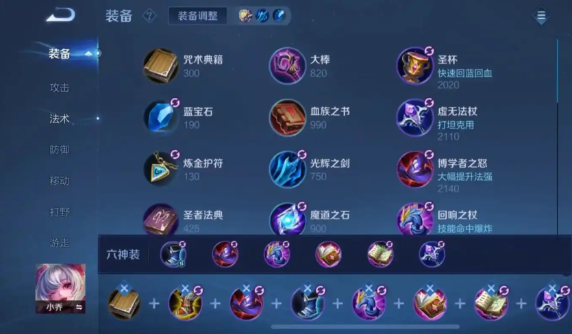游戏到了中后期,光有输出还不够,毕竟小乔是个小脆皮,很容易被对手针对。所以第五件或第六件装备一定要考虑保命装。辉月(金身)是最经典的选择,它的主动技能可以在关键时刻让你免疫所有伤害和控制1.5秒,用来躲掉敌人的致命技能,比如刺客的突进或者妲己的一套连招,用的好不好往往决定了团战的胜负。最后一件装备可以出贤者之书,它能提供巨额的法术攻击和大量生命值,让你在拥有恐怖输出的同时,身板也能稍微硬一点,没那么容易被秒掉。