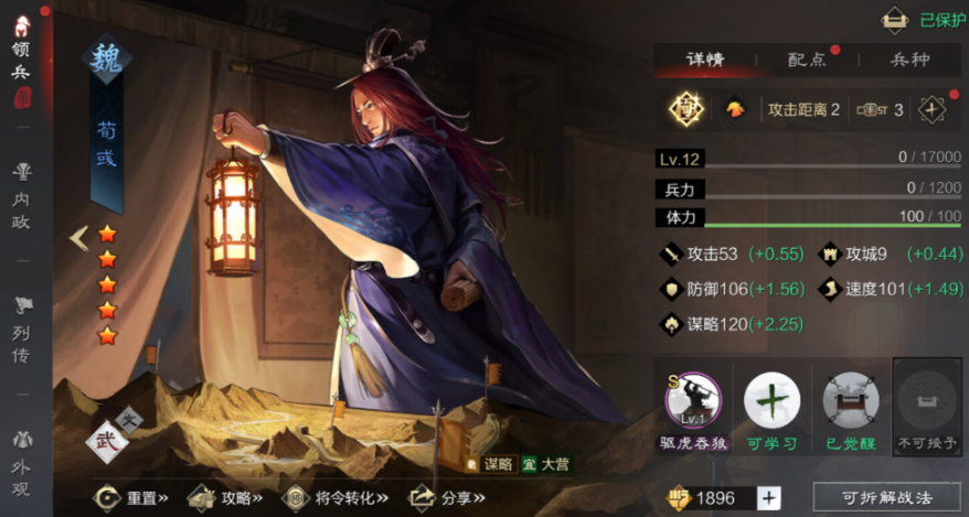 荀彧的定位就清晰多了,他是一个非常强力的核心策略输出。他的自带战法驱虎吞狼不仅能造成可观的高额群体伤害,还附带禁疗效果,这个效果对于当前版本中依赖恢复的肉步队、蜀步队等简直是天敌,能有效地打断对手的续航节奏。荀彧的谋略成长非常优秀,把他放在大营位置,只要战法搭配得当,就能提供稳定而暴力的输出。和荀攸那种需要暖机、需要配合的机制不同,荀彧的输出方式更直接,上场就能立刻改变战局。他的泛用性也更强,不单单可以组传统的魏智队,也能融入到魏骑或者其他法系队伍中,特别是当你迫切需要禁疗这个战略属性来针对特定对手时,荀彧几乎是无可替代的第一选择。如果你的阵容最缺的是一个能一锤定音的输出核心,那么荀彧的优先级通常更高。