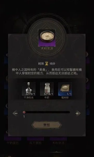 这三样东西缺一不可。干净的水和牛奶在游戏里算是比较常见的食材,你可以在各种商店或资源点轻松找到它们,但锯末粉就有点特殊了,它不是随便就能弄到的。你得到桶中人之国的水车磨坊去,那里有个BOSS叫熊灵,打败它后可以花1万银币换一份锯末粉,这可不是小数目,所以建议你提前攒点钱,别等到需要的时候手忙脚乱的。木粉浓汤属于游戏里比较高级的食谱,品质精良,制作起来不算太复杂,但材料得备齐了,不然烹饪锅可不会给你变出魔法来。