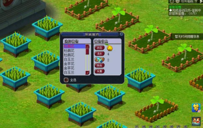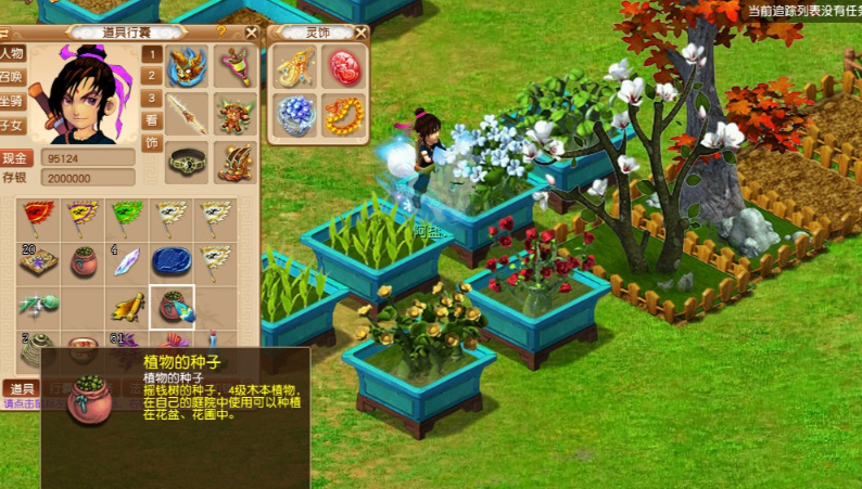 日常的师门任务和副本活动也是种子来源的重要渠道,完成这些内容后系统会随机发放奖励,其中就包括各类植物种子。虽然老花农任务时间推移被更多新玩法替代,但对于喜欢成就收集的玩家来说,它依然值得一试。通过这些日常积累,你不仅能慢慢收集到种子,还能顺便提升角色等级和资源。因为它能带来稳定的经验和其他资源收益。种子需要在庭院的花圃或花盆中栽种,根据种类不同,每天通过浇水、施肥和除虫维持状态,就能顺利收获果实。庭院布置很简单,先购买花圃或花盆安放好,然后从道具栏选择种子右键点击就能种下。刚种下时需要较多照顾,比如第一天三次浇水和施肥让状态变成笑脸,之后逐渐减少操作次数,但记得每天维护以避免植物枯萎。