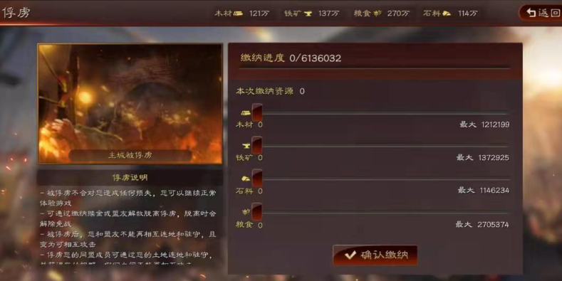缴纳赎金这个操作是有冷却时间的,每24小时你只能进行一次缴纳。你必须是所有外出征战的部队都已经返回到了主城或者分城,处于待命状态,才能成功完成缴纳。如果你一下子凑不齐全部所需的资源,也可以选择分批缴纳,但要注意,每次缴纳都会增加所谓的反叛度,只有当你缴纳的资源累计达到100%的要求,才能彻底摆脱俘虏状态。如果一个玩家在短时间内连续被俘虏,那么他下一次需要缴纳的赎金数额可能会变得更高,所以在局势还不明朗的时候,是否要立刻交钱脱身,也需要权衡一下。