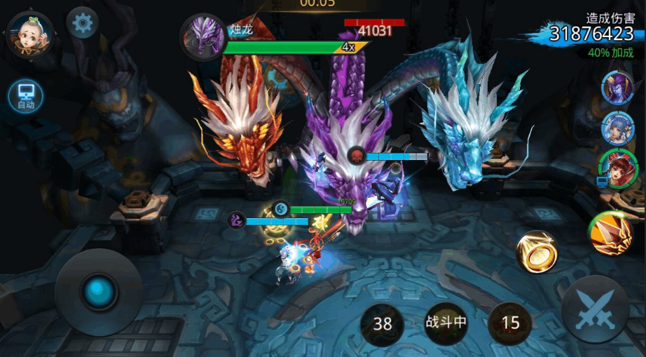 选好了坦克,咱们得聊聊具体打起来该怎么操作,这里手动操作比自动模式强太多了。自动模式下一出龙息圈,所有英雄都会傻乎乎地跑进圈子躲着,但也会停止攻击,白白浪费宝贵的输出时间。正确的手动打法是,开局就把你的主抗英雄拉到烛龙脑袋正下方的中心位置站定,其他英雄可以稍微靠后。当烛龙要喷龙息时,地上会出现黄圈提示,这时候你需要至少手动控制一个英雄(通常是你的主坦克)走进圈内,这样全队就不会受到巨额伤害。前两次龙息如果你的英雄够硬,可以尝试硬扛着继续输出,但最后两次龙息伤害飙升,必须老老实实进圈规避。在整个过程中,你的手指要勤快点儿,时刻注意拉扯血量低的英雄走位,避免被烛龙的连招或者击退直接带走。
