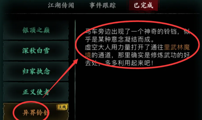要开启武林魔镜这个玩法,你得先顺着主线任务一路推下去。你需要完成名为幻境之花的主线任务,然后把红叶寺这个关卡打通关。做完这些你就会接到一个叫异界铃铛的新任务,这时候你留意一下马车旁边,会发现一个铃铛。接着你需要去挑战并通关地下石窟这个副本,成功之后就能获得一个叫做降魔铃铛的关键道具。拿到铃铛你再回去找虚空对话,这样就能成功解锁并进入里武林的地图了。解锁你靠近地图上的虚空界面,在右下角的位置就能找到并选择武林魔镜的入口了,整个过程算是游戏流程中的一个关键节点,做完它才能体验后面的核心内容。