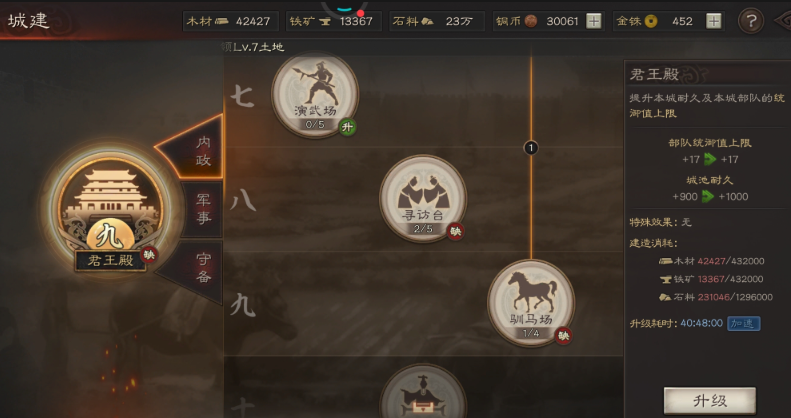 你需要格外关注石料的积累,因为它是升级7本的最大瓶颈。日常建筑升级要有所侧重,前期可以优先提升石料产地的等级,并利用屯田功能针对性获取石料。同时,要合理分配征兵和建筑的资源消耗,避免因连续征兵而导致资源枯竭,影响关键建筑的升级进度。整个流程需要你对任务线、资源产出时间和兵力恢复有一个清晰的规划,才能确保各个环节无缝衔接,流畅地过渡到七本阶段。