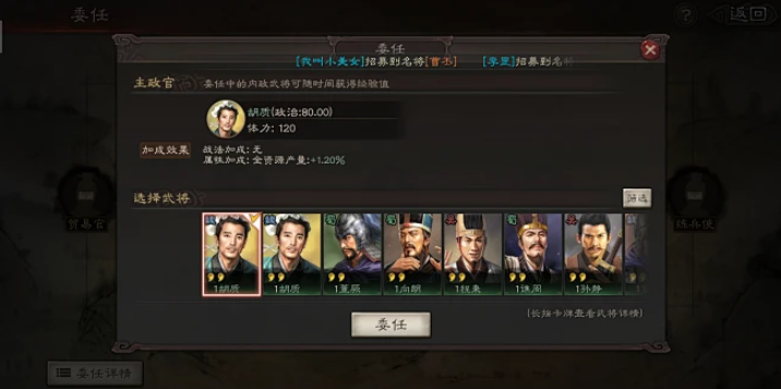 内政官的技能和属性点是影响委任效果的关键因素,每点政治属性约能增加0.03%资源产量,而每点魅力属性则能提升约0.03%的特殊事件概率,因此玩家在分配自由属性点时应根据具体职位决定,例如贸易武将应加魅力,练兵武将应加政治。政治型内政官如荀彧,其满级技能可提供72点政治值,显著增强资源加成;魅力型内政官如小乔,在驯马或锻造时,应优先加点魅力以提高高阶概率,因为高阶装备或战马的收益远超过节省的资源消耗。玩家应培养内政武将,让他们学习内政战法,例如见机行事可加政治值,而B级或A级技能也能带来额外收益。需所有非内政武将虽然可以委任到内政岗位,但他们不会获得经验,无法升级,因此只有自带内政技能的武将才能发挥最大作用。司马徽的寻访技能能让高阶武将出现概率提升9%,这相当于多出150点魅力值的效果,因此玩家在招募到内政武将后,应先根据其属性分配加点,再委任到合适职位,这样才能在内政系统中获得持续优势。