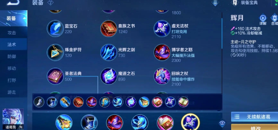 最后一个装备格的选择往往决定了团战的容错率。辉月(金身)是最常见的选择,它的主动技能能在关键时刻让诸葛亮进入短暂的无敌状态,完美规避掉敌方的致命技能或控制,为自己争取技能冷却时间或等待队友支援。在局势非常顺风且生存压力不大时,也可以考虑用贤者之书替换辉月,它能进一步强化输出和提供可观的生命值。这套出装虽然伤害爆炸,但对玩家的操作和意识要求也相对较高,需要熟练掌握技能连招和进场时机。