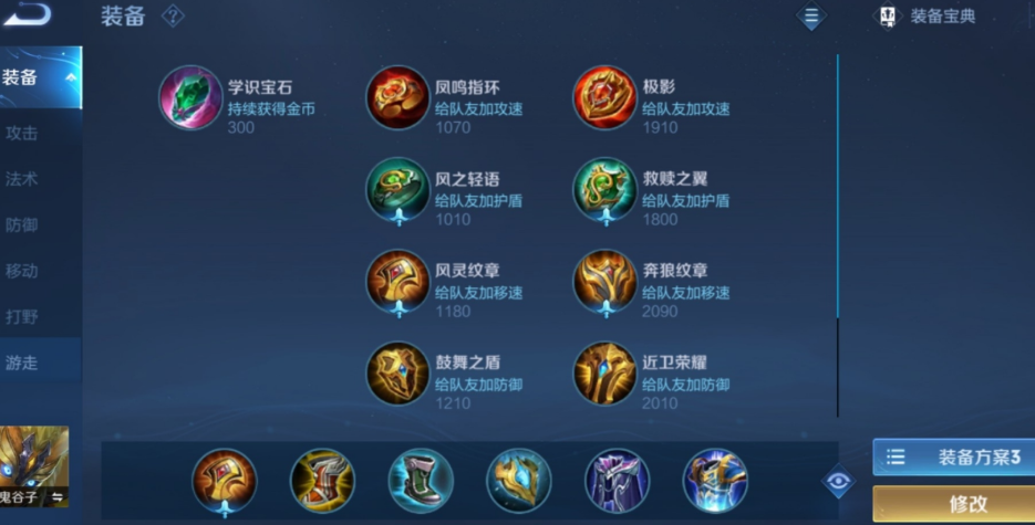 鞋子出完后,就该考虑把辅助装升级成二级了。这时候你有两个非常好的选择:近卫荣耀和奔狼纹章。近卫荣耀能给你周围的队友增加双抗,相当于给团队加了一层小护甲,在抱团打架的时候能让队友更耐揍一些,属于比较稳扎稳打的防守增益型装备。而奔狼纹章就激进多了,它的主动技能可以提供一次爆发性的团队加速,配合鬼谷子的大招群体隐身,能瞬间让整个队伍像幽灵一样冲到敌人脸上,打一个措手不及的完美开团。这两件装备没有绝对的谁好谁坏,就看你们队伍的风格是偏保护还是偏强攻,我个人更偏爱奔狼,那种带着队友冲锋的感觉实在太爽了。
