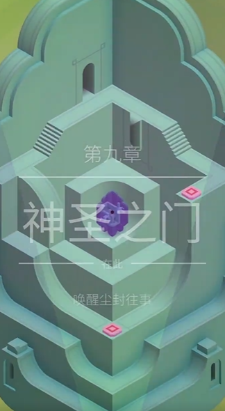 关卡后半段需要综合利用攀爬与旋转。控制角色爬上右侧梯子的最高点,然后旋转下方的机关。旋转后,沿着新生成的路线向下走,直到抵达一个黄色的方块位置。这一过程考验玩家对三维空间路径连接的预判,旋转机关的目的在于将原本无法通行的梯子与平台连接起来。当角色到达黄色方块位置并触发机关后,旋转上方的机关,使角色能够沿着路线向上走。走到顶端后向右转,直至道路尽头,此时再旋转一次机关,便能将最后一段道路接通,角色即可顺利步入最终的传送点,完成第九章神圣之门的全部挑战。