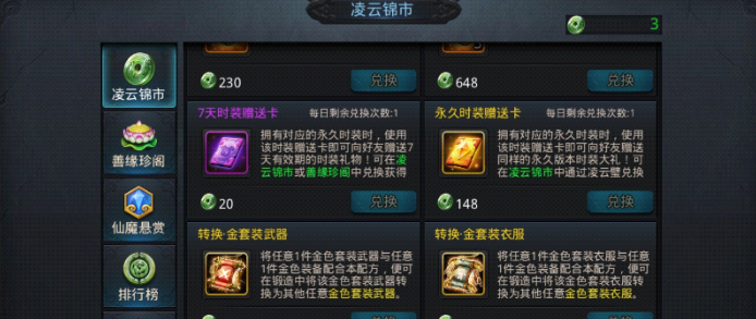 时装的赠送则需要使用专门的时装赠送卡道具,这些卡分为3天、7天、30天和永久四种类型,玩家可以在善缘珍阁或凌云锦市中兑换,消耗元宝或充值获取的凌云壁来获得。赠送时,从好友列表选择好友并进入赠送礼物选项,在界面中挑选合适的时装卡和时效,确认后完成操作;接收方需在好友对话框中点击时装照片激活,时效从激活时开始计算。