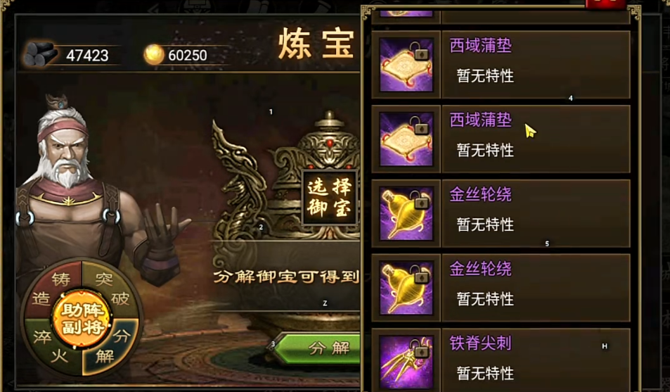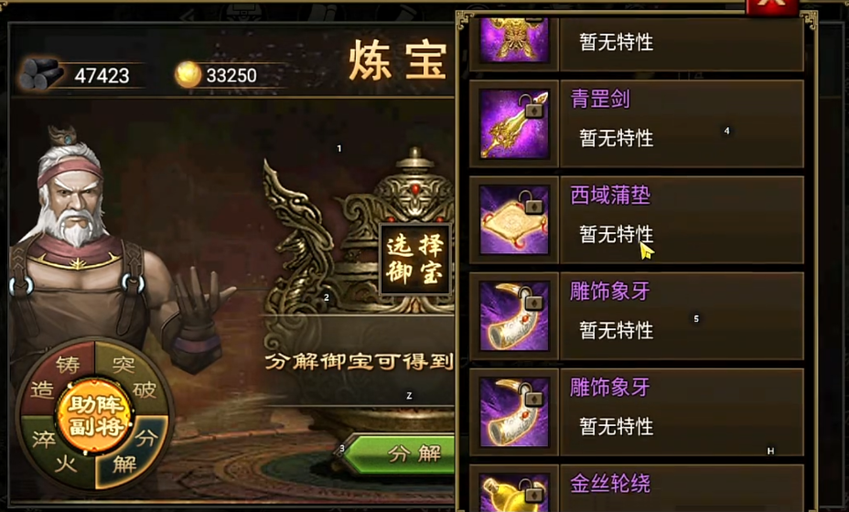 御宝锻造完成后还可以通过淬火和分解系统进行深度强化,只有紫色品质的御宝才能进行淬火操作,淬火可以随机赋予御宝攻击、防御、血量等额外属性,但需要消耗木炭资源,前三种基础属性通常无法同时出现,需要根据武将定位进行取舍,而定军等特殊效果则能在特定场合发挥巨大作用,对于不需要的低阶御宝,可以将其分解以获得精粹资源,例如白色御宝分解得30精粹,蓝色得60精粹,绿色得150精粹,黄色得400精粹,这些精粹是后续强化和突破高阶御宝的重要消耗品。