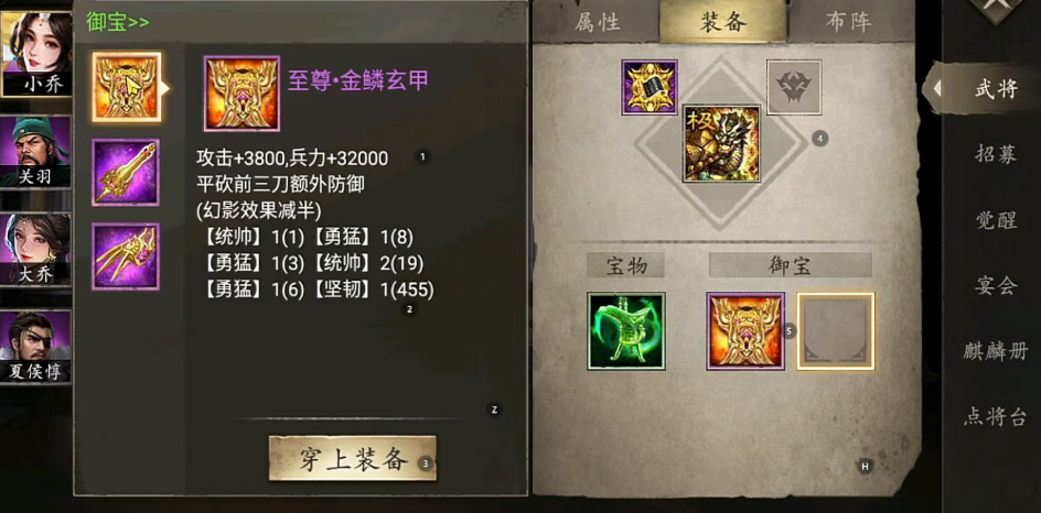 针对不同投入程度的玩家,御宝的打造选择也有所不同,对于资源有限的平民玩家,建议优先打造性价比最高的黄色流光玉符,因为除了红枪、红甲、红镜和黄符需要金币外,其余御宝均可通过免费资源制作,而愿意投入的玩家在通关190至192副本后,则可以打造全系列红色御宝以获得顶尖属性,在搭配上,攻击型武将适合佩戴火龙枪或流光玉符以提升输出,防御型武将则优先选择红甲或黄甲来增强生存能力。