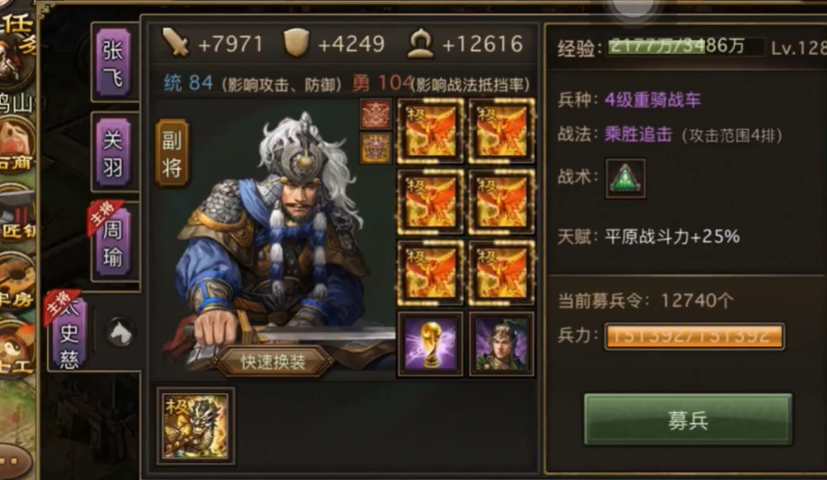 主流配置包括周瑜、典韦、太史慈和张飞。每位武将需要配备特定的套装并可能携带副将以补强功能。周瑜通常装备灵龟套装,其核心职责是利用战法与敌方第一武将实现同归于尽,从而封锁住敌人的后续战法释放。典韦则是驱虎套装的主要穿戴者,并常与副将周泰搭配,他的任务是处理第二个武将的残余兵力并尝试封堵其关键排数的行动。太史慈一般使用凤凰套装并获得赵云作为副将,其战术价值在于利用两次战法触发斩杀效果,清理战场并营造优势。最后登场的张飞承担收割任务,装备烛龙套装,其最终战法的释放时机尤为关键。