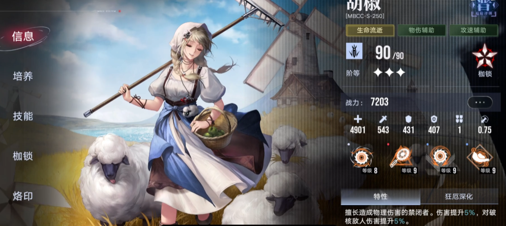 胡椒的技能组决定了她作为特定功能角色的培养价值。她的普通攻击松土是挥舞圆锯进行多段攻击,每段造成基于自身攻击百分比的物理伤害,技能升级能提升伤害系数。核心技能人形收割机作为必杀技,开启后能在持续时间内显著提升自身的攻击速度,从而在爆发期内打出更高的伤害频率。她的被动技能作物管理能根据场上存在携带生命流逝标记的敌人数量,为自身叠加攻击速度增益;狂厄深化技能乘胜追击则能让她对携带多种生命流逝标记的敌人造成额外伤害。这些技能表明,胡椒的强度与攻击速度属性以及敌人是否附带流血状态密切相关。