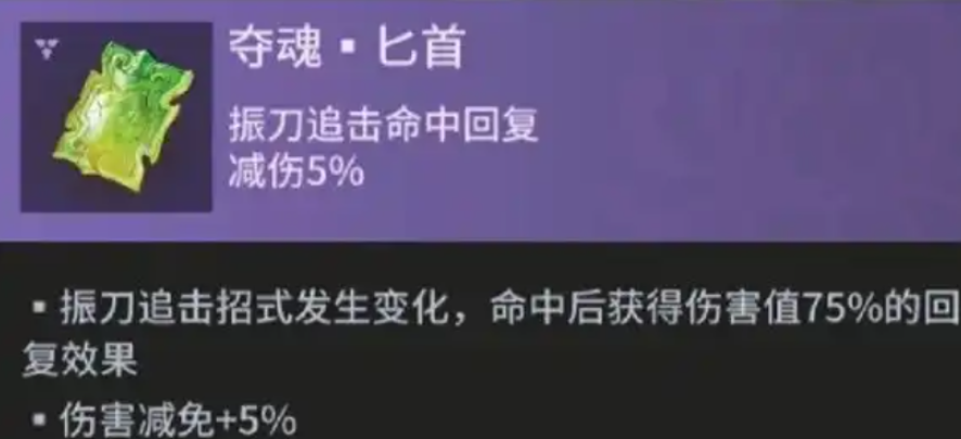 游戏中还存在名为夺魂的魂玉,其效果的触发依赖于玩家的振刀操作。装备该魂玉后,在成功施展振刀时,能够根据造成的伤害值按比例回复自身的血量和护甲,这是一种通过高风险博弈来换取生存续航的强化手段。