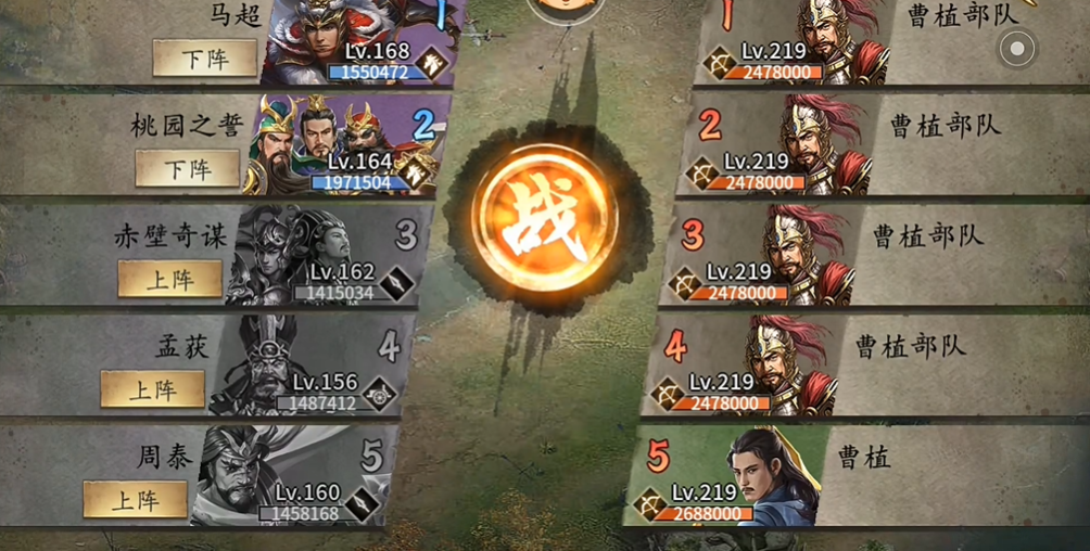战前需完成武将与装备的极致配置,夏侯渊穿戴极凤凰套装,无副将配置,核心作用是首发扛伤并在最后一排释放战法,为后续武将提供伤害增益与减伤buff。周泰携带喷火车,穿戴极霸下套装,搭配方圆阵,借助阵法效果降低护甲损耗,凭借高格挡与不屈特性承伤敌方主力输出,避免被敌方战术克制导致快速破甲。陆逊配备残血三车与极烛龙套装,选用锋矢阵,副将搭配吕布,释放战法前需观察敌方状态,若敌方已触发关键词条则转为普攻输出,依靠火焰伤害持续压制敌方血线。黄月英作为核心输出,搭载满状态二车,穿戴极驱虎套装,搭配高暴击宝物,依靠斩杀与暴击效果实现高效兵力交换,打出一换二的战斗收益。曹操负责收尾,携带防御向装备与护盾技能,接住敌方残将伤害并完成最终收割。