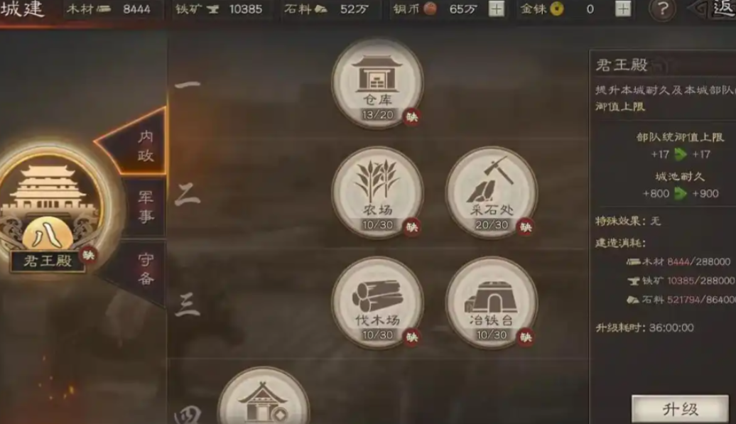 君王殿、仓库、军营是核心,尤其是君王殿等级决定了统御值上限,早点升到7本才能上阵更强力的武将。资源建筑别平均升,根据任务需求调整,比如缺木头就多升伐木场。加入同盟能加速发育,不仅有机会蹭高级资源地,还能获得同盟科技加成。每天策书买满,用来屯田或练兵,性价比很高。