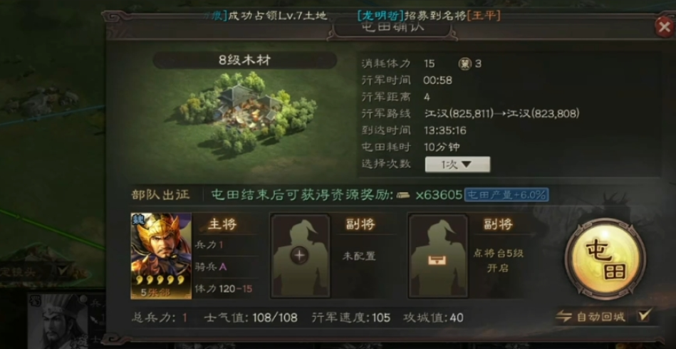 开荒阶段重点提升势力值和声望,这两项决定了你能占领的土地数量和质量。初期尽量多打三级地,武将等级到8级左右就能尝试打四级地。战法等级很关键,优先把主力武将的自带战法升满,减少兵力损耗。如果资源紧张,屯田时优先选石料,因为城建升级对石料需求最大。新手期48小时内,武将下阵会返还预备兵,这时候可以大胆调整阵容,多试错。