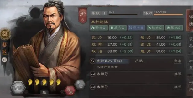 木材官、冶铁官、粮草官和采石官等资源类内政武将,推荐携带增加政治属性的马匹。政治属性直接提升资源产量和屯田收益,例如蔡邕、陈群等武将的政治属性较高,搭配政治加成的马匹能够进一步强化其效果。若武将自带资源产量加成的战法,如陈群的清流雅望或蒋琬的克遵画一,则更需优先提升政治属性,确保资源收益最大化。