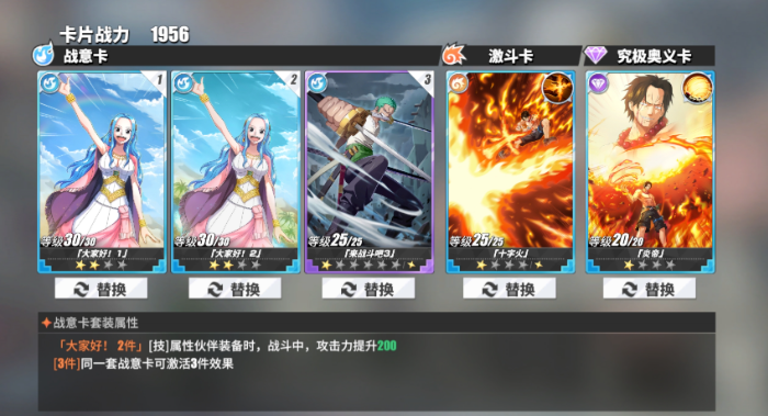 战意卡系统相当于角色的装备体系,分为力技心三种属性套装,品质由低到高为绿、蓝、紫、橙。初期可强化绿色品质卡片过渡,后期逐步替换为紫色和橙色套装。紫卡优先选择暴击套,橙卡则需集中资源培养主力角色的一套。战意卡主要通过无尽探险、勇者挑战和商店兑换获取,每日需合理安排体力分配进行刷取。激斗卡和究极奥义卡同样影响角色强度,可通过抽卡和商店兑换获得。