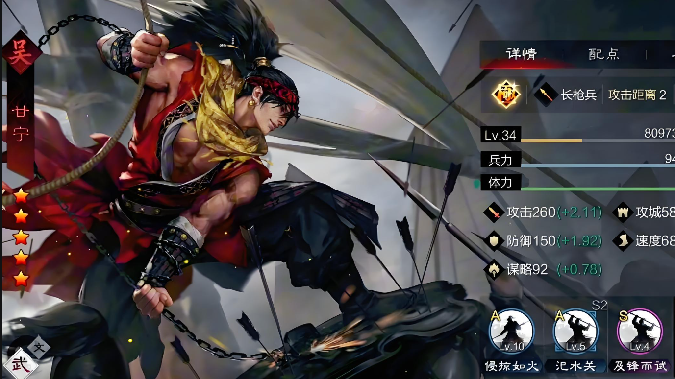 凌统在碰瓷队中的核心价值在于其独特的洞察机制与稳定的前四回合免控能力。作为四星武将,他凭借战法国士无双能够免疫混乱、犹豫等负面状态,确保队伍在关键回合稳定输出或释放控制技能。碰瓷队的核心思路是利用低成本武将组合,通过高爆发或控制效果消耗敌方主力兵力,为后续主力部队创造优势。凌统通常搭配朱儁、甘宁等四星武将,形成以速度和控制为主的战术体系。