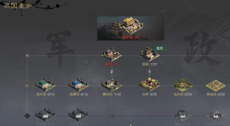 科技树建设是提升部队实力的另一关键。城主府和封禅台能提高部队COST值上限,让你配置更高级的武将。兵营、校场和募兵所则直接影响兵力,兵营每升一级可增加单个武将200带兵上限,校场能让你同时派出多支部队作战。疾风营、铁壁营等设施能针对性提升部队属性,比如速度、防御或谋略,满级后还能激活强力技能。预备役所和统帅厅也很重要,前者能快速补充兵力,后者让你为部队配置前锋,大幅增强战斗力。