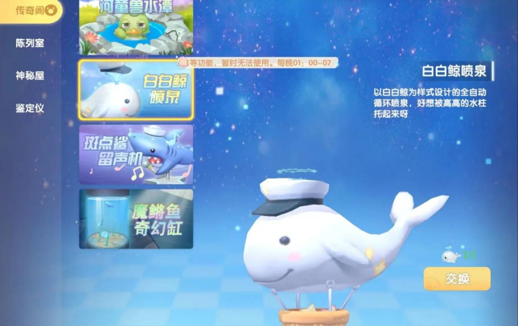 成功钓到白白鲸后,需前往爱心广场的NPC大力处兑换。打开地图选择爱心广场区域,或直接点击角色列表中的大力头像快速传送。与大力对话进入商会信息界面,选择传奇阁兑换白白鲸喷泉。该喷泉为动态家具,摆放后点击互动可触发喷水动画,喷泉高度与频率固定,但视觉效果突出,适合作为家园核心装饰。